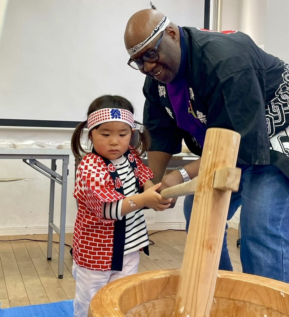The children watched closely as the sticky rice was turned into soft, stretchy mochi, and they cheered each other on while taking turns helping with the pounding.