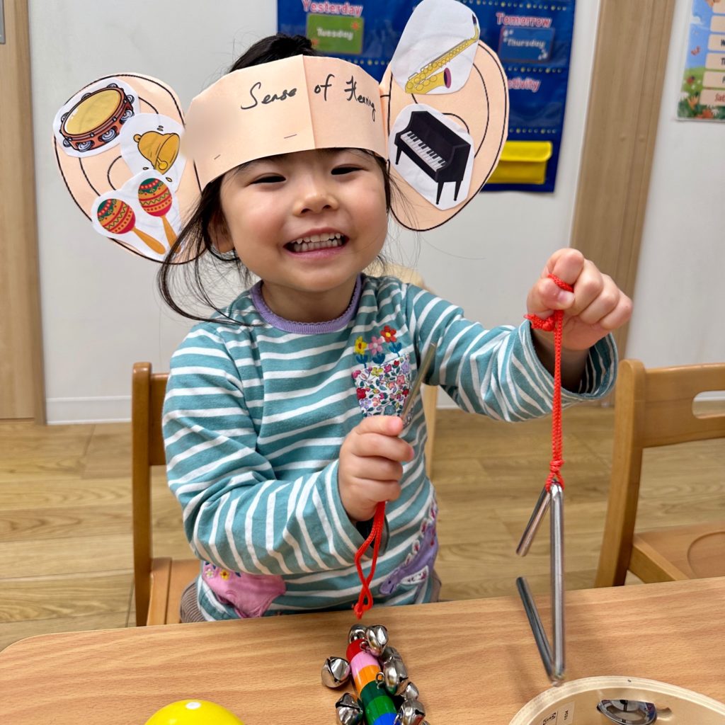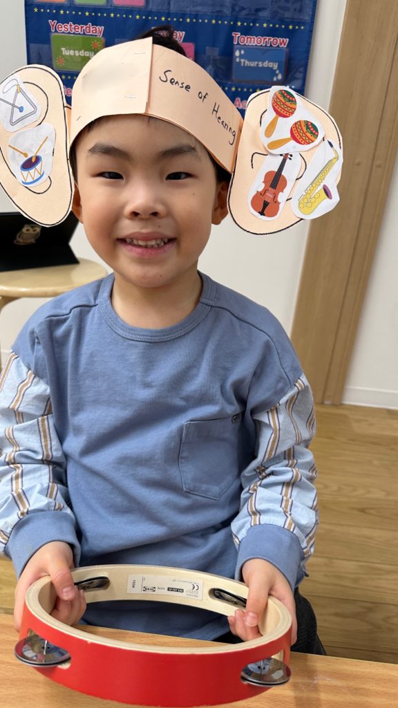 This morning we explored the sense of hearing by listening to different musical instruments. The children heard the sounds of the drums, saxophone, piano, violin, and tambourine, and talked about how each instrument makes a unique sound.