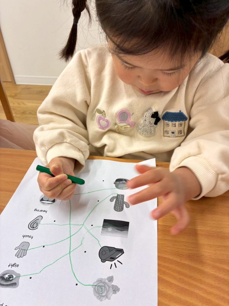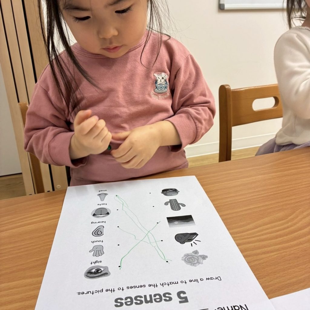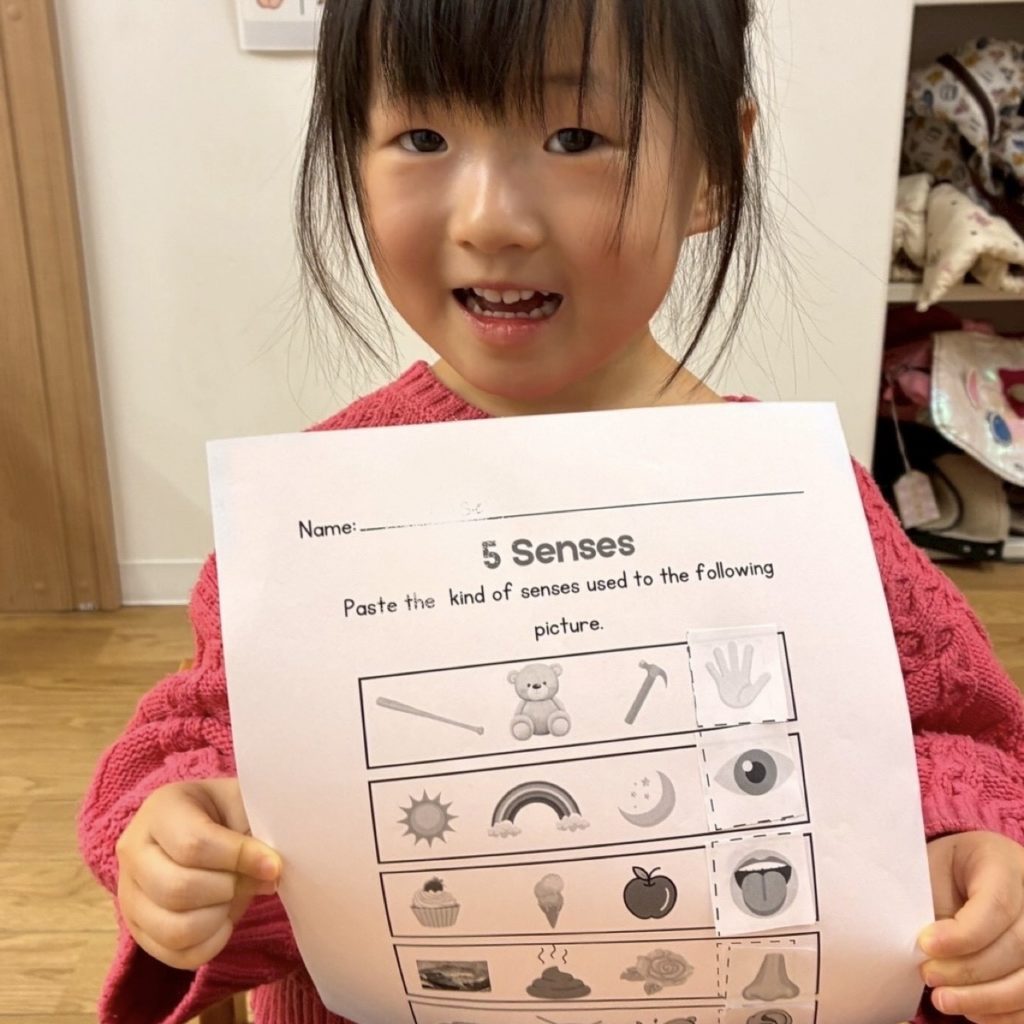 The students are becoming more confident in identifying each sense and understanding how we use them in our daily lives. During our discussion, they eagerly shared examples of what they can see, hear, smell, taste, and touch, showing a growing awareness of how their bodies help them explore the world around them.